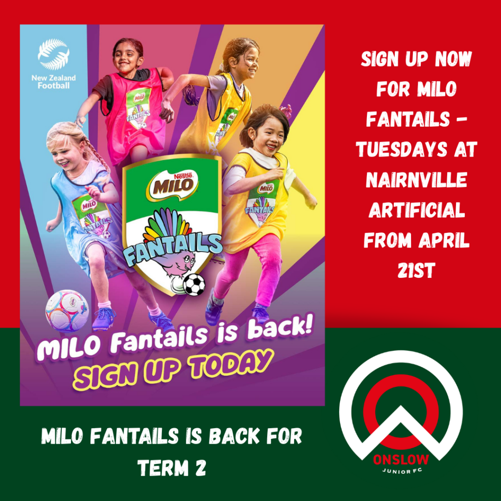MILO Fantails is a programme designed to attract new female players to the beautiful game – Onslow is offering this to girls aged 4-13 years. Sessions are focused on helping girls make friends, have fun, improve their skills, and be active through football.